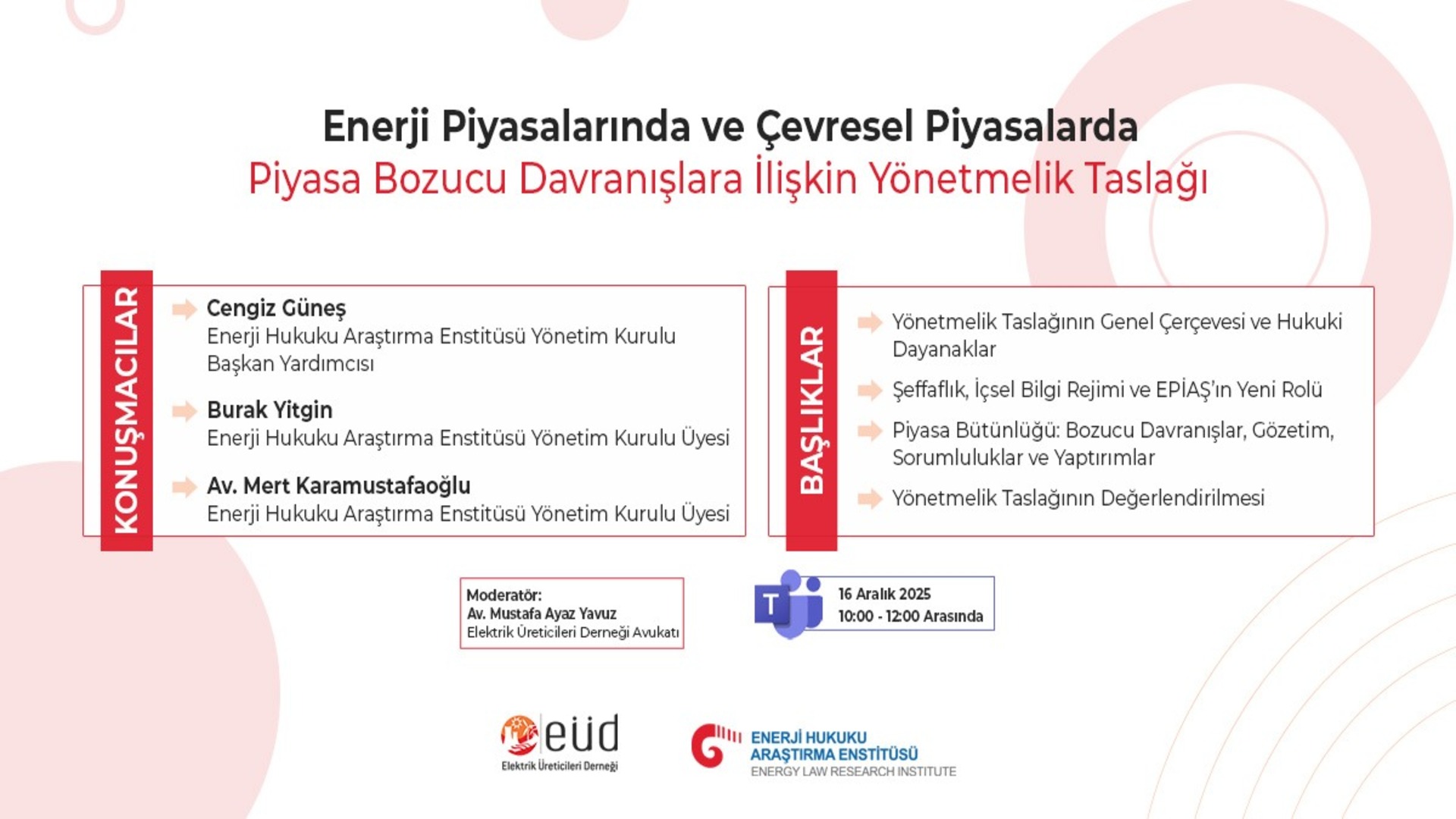 The webinar titled “Draft Regulation on Market Distorting Practices in Energy Markets and Environmental Markets,” organized in collaboration between our Association and the Energy Law Research Institute (EHAE), was successfully and productively completed.
